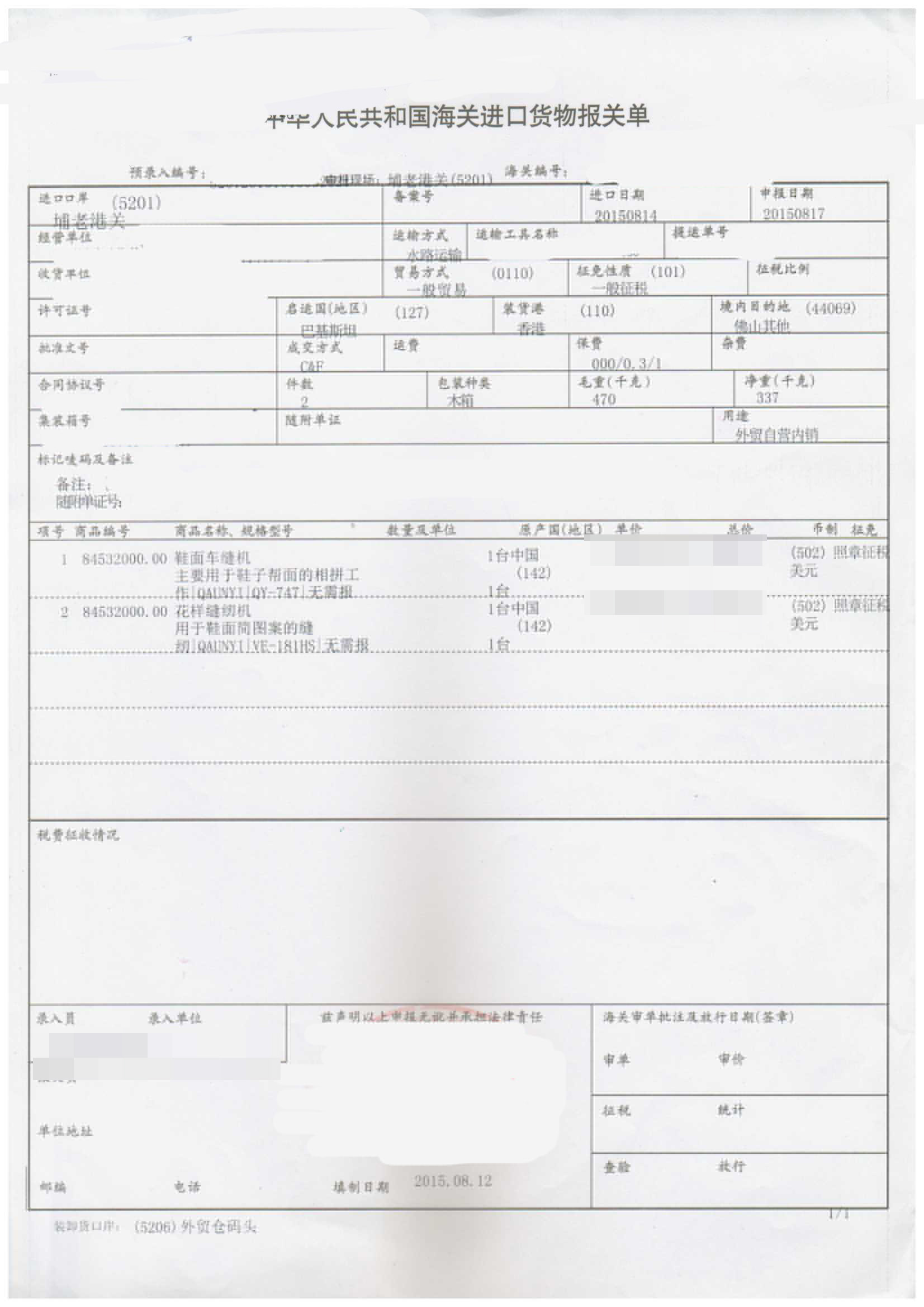 進(jìn)口日期:20150814客戶:佛山市某鞋機(jī)有限公司