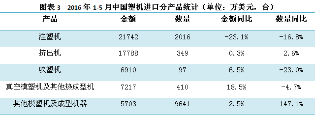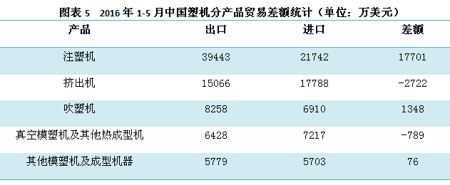 圖表5的統計數據表明,2016年1-5月中國塑機的五大類產品進出口貿易中,注塑機、吹塑機、其他模塑機及成型機器等三大類產品均為貿易順差,擠出機、真空模塑機及其他熱成型機兩大類產品則為貿易逆差。
