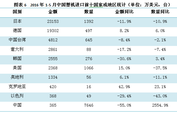 【文章標題】:2016年1-5月中國塑料機械進出口報關雙雙下降 http://www.fnbkj.com/news1/28.html 轉載請注明出處