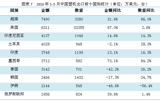 越南成為中國塑機最大進口來源國,且同比有大幅度的增長。美國、土耳其、印度、墨西哥和俄羅斯聯邦等五個國家也分別有不同程度的增長,其中美國增幅高 達 58.2%。印尼、泰國、伊朗、韓國等四個國家出口金額同比則有大幅度的下降,其中泰國的下降幅度達到51.9%。和泰國同樣情況的還有伊朗,2016年 的前5個月中,每個月都比去年同期相比均有下降,1-5月整體下降了46.6%。
